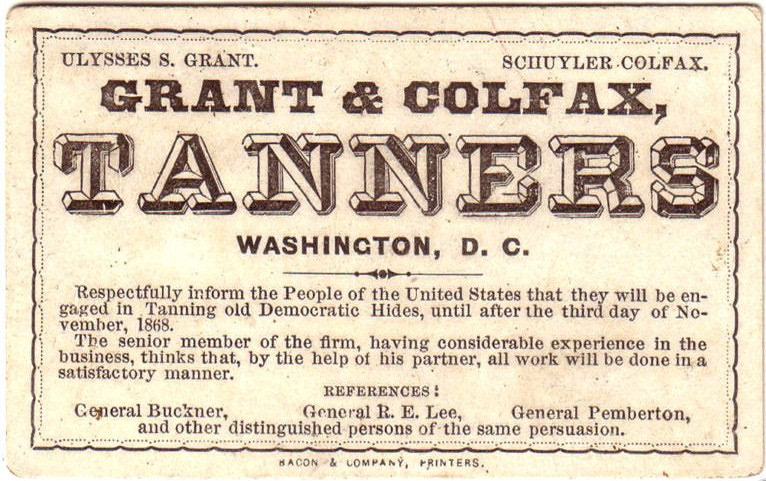 The ad I saw for Grant's first run for president. My apologies if you are a fan of Grant's second VP, Henry Wilson, or huge General Buckner fan, as this may be difficult to look at. But the idea of turning a pretty nasty seeming job (Grant hated being a tanner and hated the idea of following in his father's footsteps to be one) into a pretty good burn on the Confederacy is pretty cool.